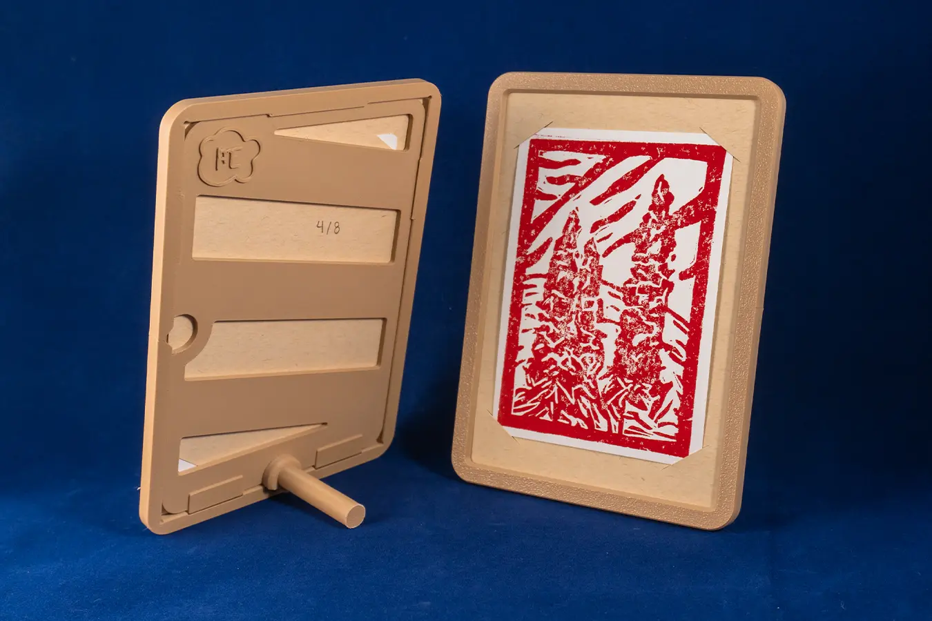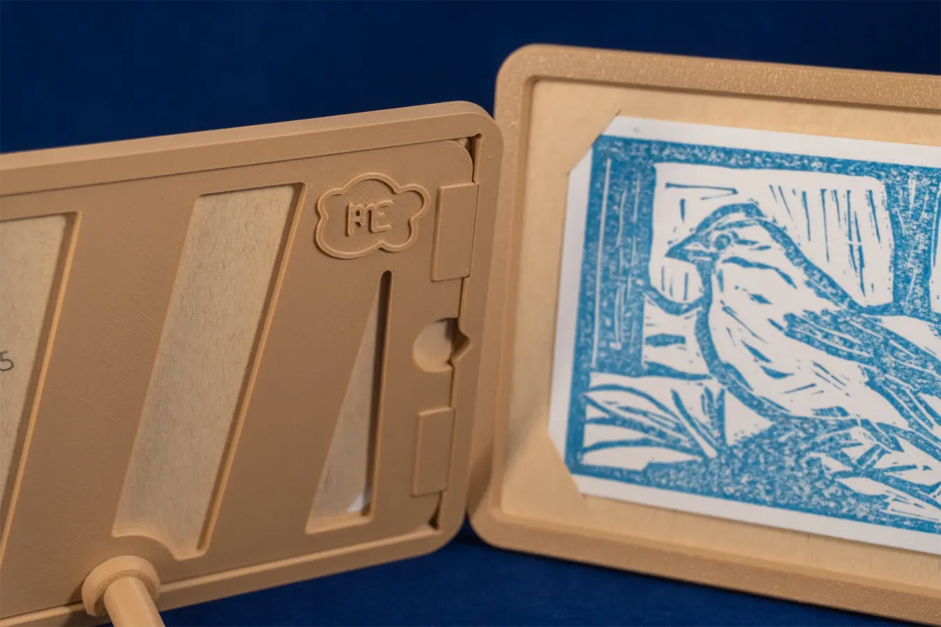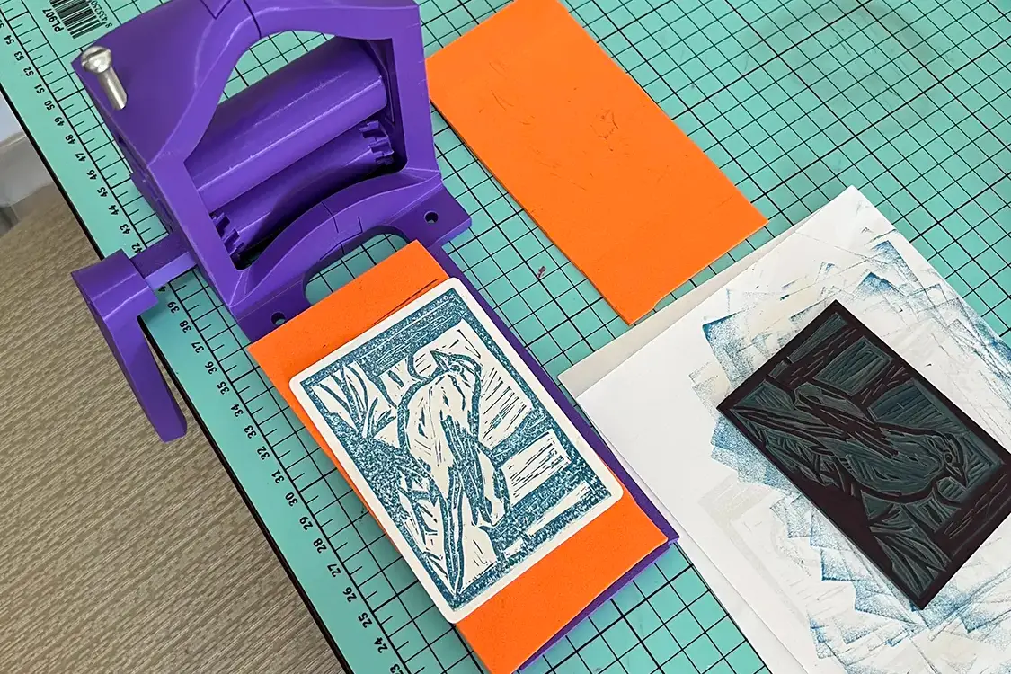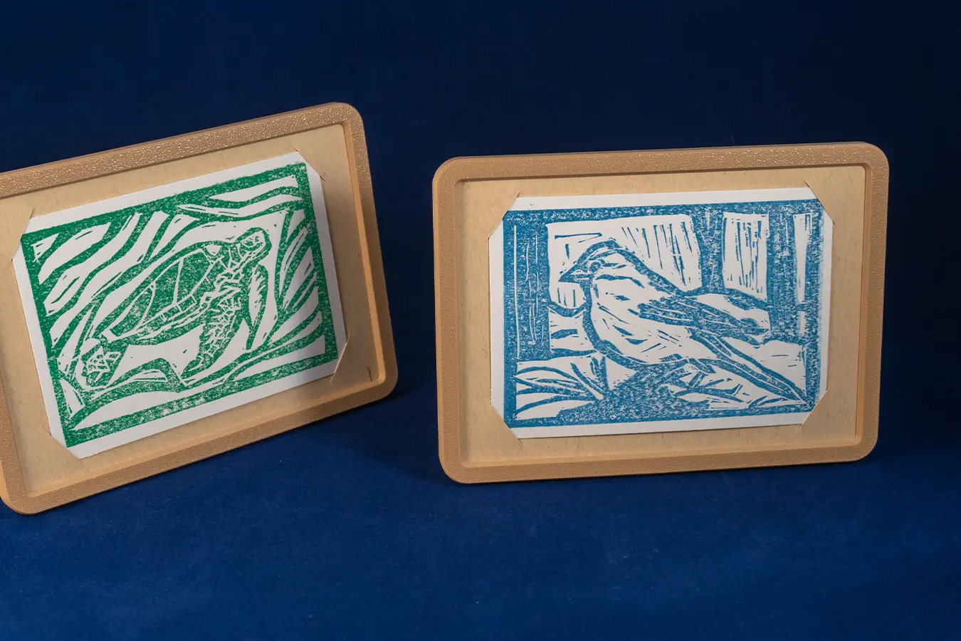 Ilustración de especies de Canarias, el pinzón azul, el tajinaste rojo y la tortuga verde, realizadas con la técnica de linograbado. Además, se imprimieron en 3D unos marcos para colocarlos.